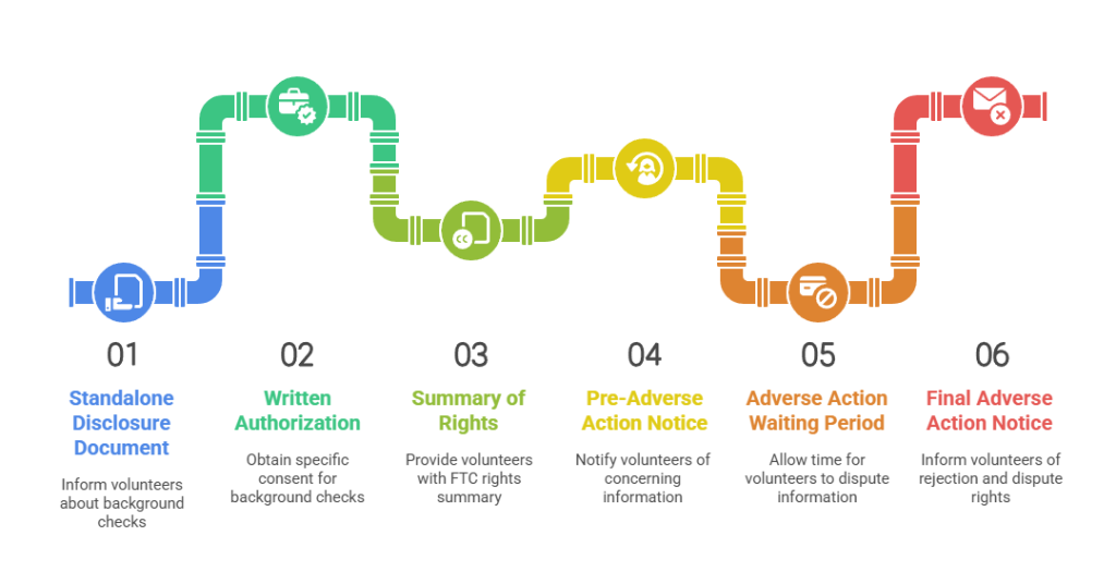 • Standalone disclosure document: Separate form informing volunteers that background checks will be conducted through a Consumer Reporting Agency