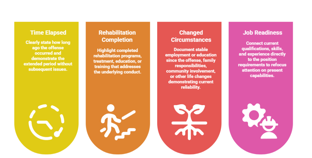 - Time elapsed: Clearly state how long ago the offense occurred and demonstrate the extended period without subsequent issues.