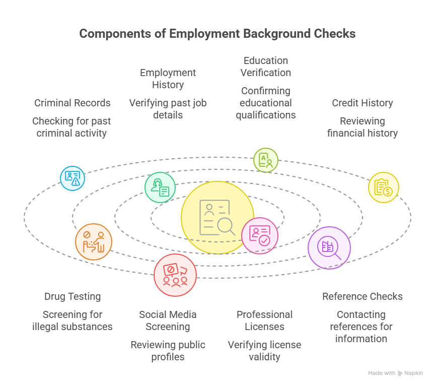 An employment background check typically includes verifying a candidate's criminal records, employment history, education, credit history, and sometimes drug testing and social media screening.