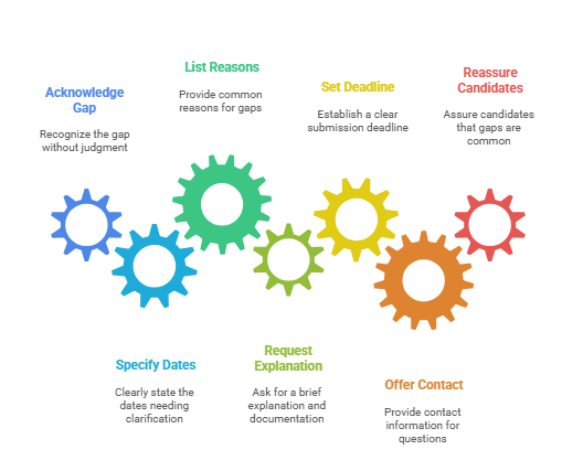 When gaps appear during screening, outreach messages should be professional and non-judgmental. Effective communication requests additional information to complete verification. Providing specific gap dates and offering multiple explanation categories helps candidates understand what information is needed.