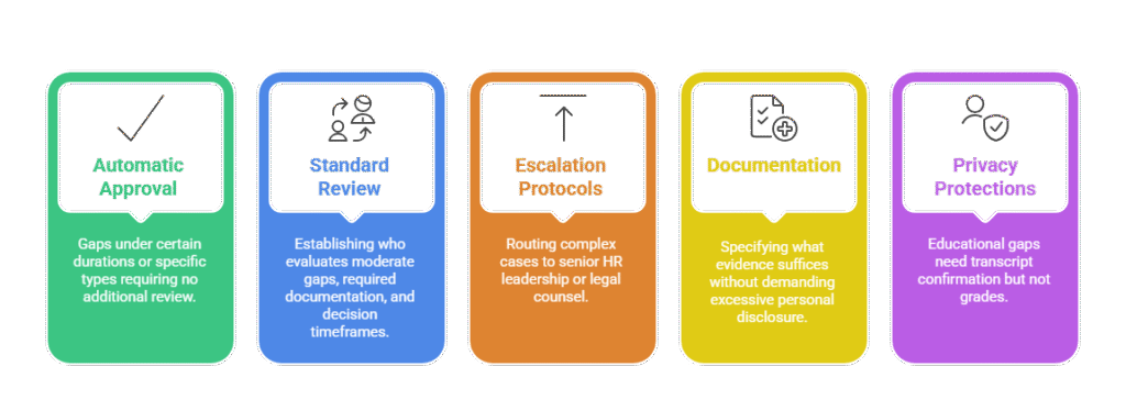 Written employment gap policies provide consistency, legal protection, and operational efficiency. Effective policies begin with clearly defined gap thresholds specifying minimum unemployment duration triggering review. Most organizations set this between 30 and 90 days, recognizing shorter periods often represent normal job transition timing.