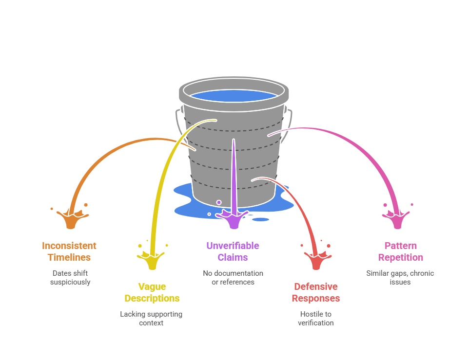 • Inconsistent timelines: Employment dates that shift between application, interview, and verification stages