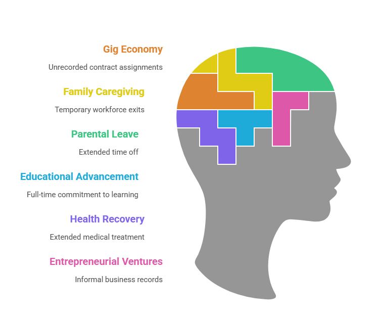 • Entrepreneurial ventures: Starting businesses that may not have generated formal payroll records.
