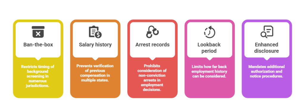 • Salary history prohibitions: Prevents verification of previous compensation in multiple states