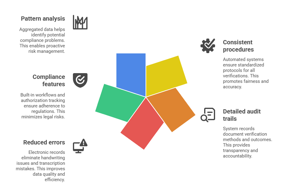 • Consistent verification procedures: Automated systems enforce standardized protocols across all verifications