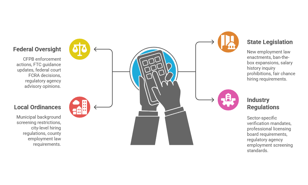 • Local ordinances: Municipal background screening restrictions, city-level hiring regulations, county employment law requirements