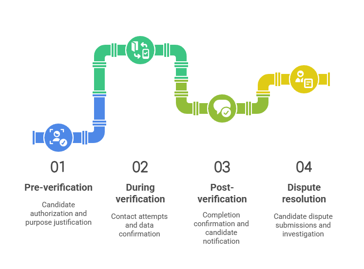 • Post-verification: Verification completion confirmation, candidate notification, hiring decision rationale, adverse action notices if applicable