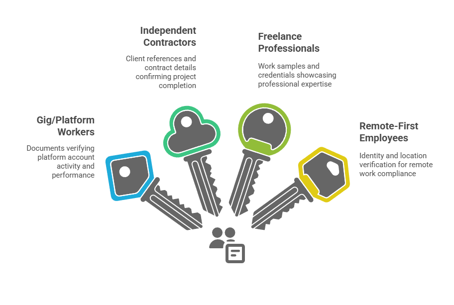 • Gig workers and independent contractors present unique verification challenges requiring alternative documentation approaches since traditional employer-based verification models often fail for these arrangements.