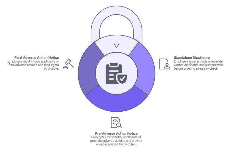 - Standalone disclosure and written authorization. Before ordering a registry check through a CRA, the employer must provide the applicant with a standalone written disclosure and obtain written authorization. The disclosure must consist solely of the disclosure. Bundling it with other onboarding documents does not satisfy the standalone requirement.