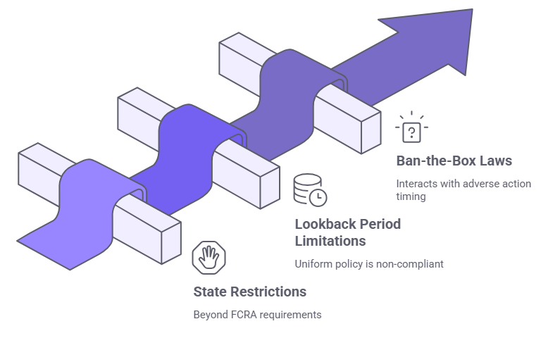 - Ban-the-box and fair chance laws interact with registry-based adverse action timing in states that have enacted them. California law imposes a seven-year lookback limit on certain criminal history reporting regardless of salary threshold, which differs from the federal FCRA rule. New York has enacted fair chance hiring frameworks at both the state and city levels, with specific requirements varying between the two. Illinois's Job Opportunities for Qualified Applicants Act imposes ban-the-box timing requirements for private employers with 15 or more employees. These examples are illustrative, not exhaustive.