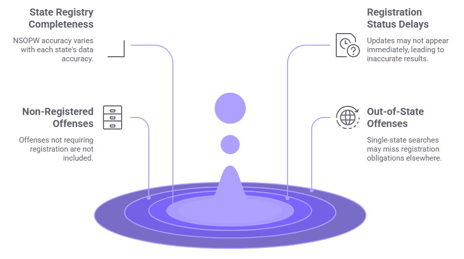- NSOPW coverage depends on state registry completeness. Because the NSOPW queries state registries in real time rather than maintaining its own database, its completeness varies with each state's accuracy. Not all qualifying offenders in all jurisdictions appear at any given time. A clean NSOPW result does not confirm the absence of registration requirements elsewhere.