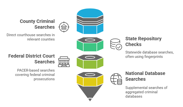 This layered approach provides overlapping coverage that reduces the likelihood of missing relevant criminal history.