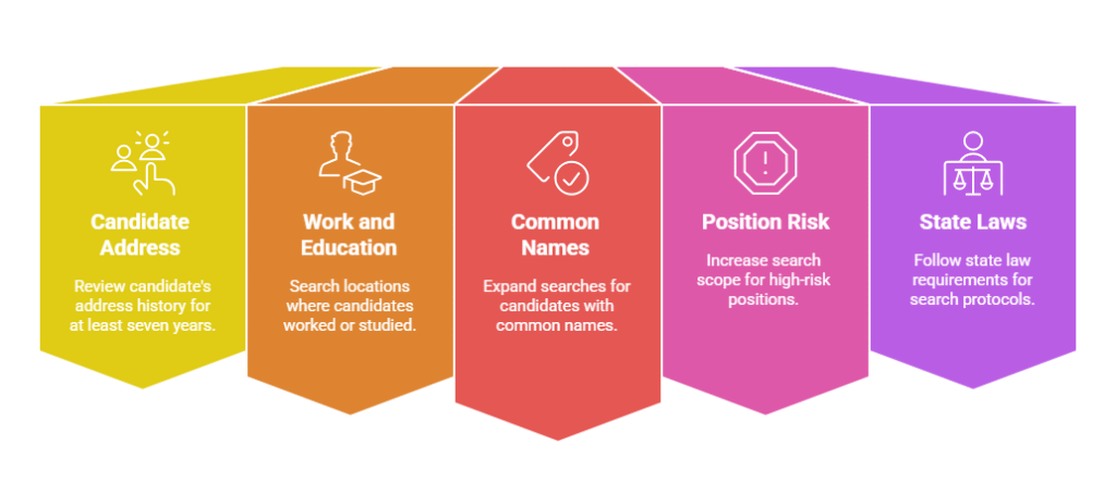 - State law requirements: Some states mandate specific search protocols or extended geographic coverage for regulated positions
