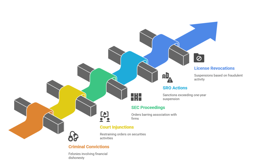 - Criminal convictions: Felonies within 10 years involving false statements, theft, embezzlement, securities violations, or breach of fiduciary duty.