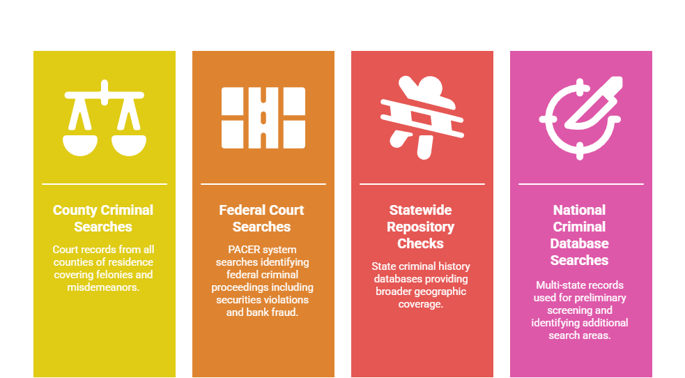 - National criminal database searches: Multi-state records used for preliminary screening and identifying additional search areas.