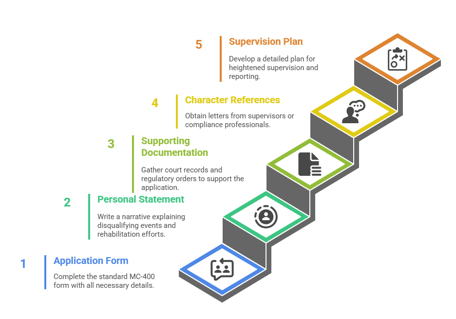 - Personal statement: Detailed narrative explaining disqualifying events, accepting responsibility, and describing rehabilitation.