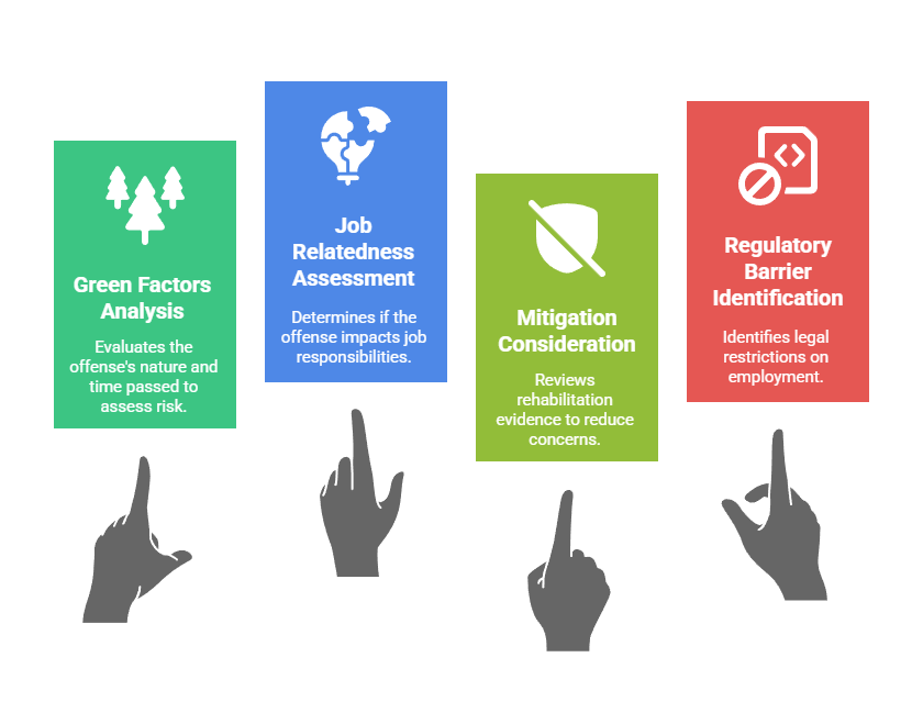- Green factors analysis: Evaluate nature and seriousness of offense, time passed since offense, and nature of position sought.