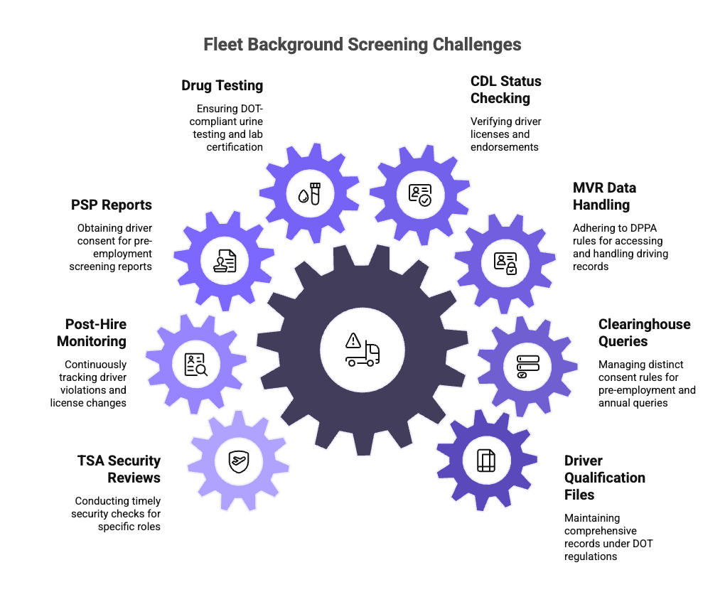- Fleet background screening is not a single pre-hire check. It is a multi-step compliance workflow covering Driver Qualification Files, Clearinghouse queries, MVR pulls, DOT drug testing, PSP reports, and ongoing post-hire monitoring that most general-purpose ATS platforms were never built to handle.