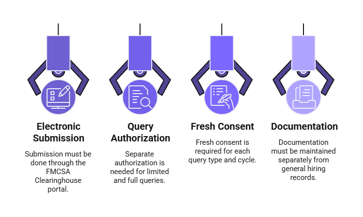 Under 49 CFR 382.701(d), drivers must provide electronic consent through the Clearinghouse system before employers can conduct queries. Generalized background check consent forms do not satisfy this specific federal requirement. Consent is query-specific, meaning employers must obtain fresh consent for pre-employment, annual, and reasonable suspicion queries.