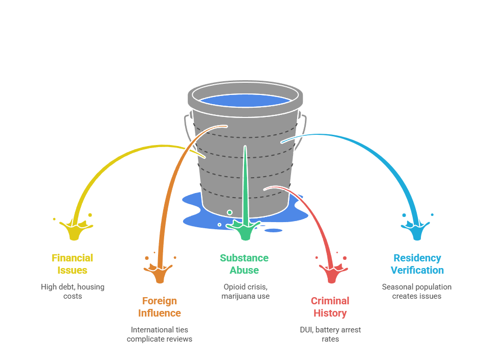Financial considerations arise from Florida's high cost of living in metro areas creating financial strain. Foreign influence issues stem from South Florida's international population creating frequent foreign family member concerns. DUI arrests are the most common criminal issue in Florida investigations. Federal clearance adjudication regarding marijuana use remains unaffected by state law changes—any marijuana use remains disqualifying for federal positions.
