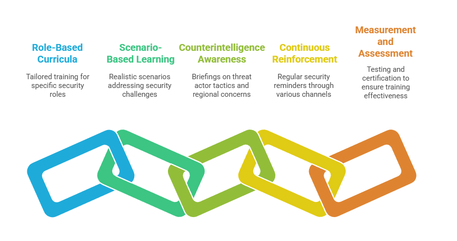 - Measurement and Assessment: Regular testing of security knowledge through quizzes, practical exercises, and annual certification programs ensuring training effectiveness and knowledge retention