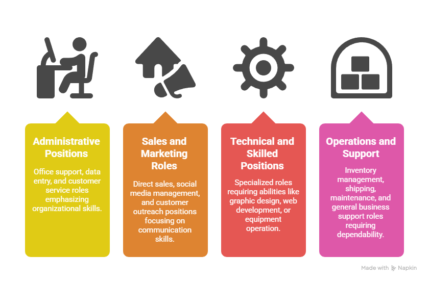 - Administrative Positions: Office support roles, data entry, and customer service positions that emphasize organizational skills and reliability. Small businesses often need versatile employees who can handle multiple responsibilities. These positions typically offer opportunities for growth and expanded responsibilities based on performance rather than formal credentials.