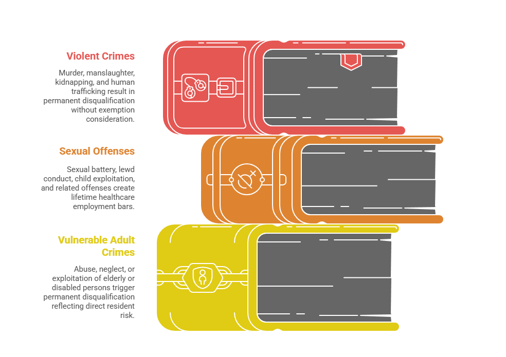 Florida law establishes permanent employment bars for convictions including murder, manslaughter, sexual battery, lewd conduct, kidnapping, human trafficking, and abuse of elderly or disabled adults. These offenses demonstrate direct threats to vulnerable residents and do not allow exemption consideration. Facilities employing individuals with permanent disqualifying offenses face immediate jeopardy citations and potential license suspension.