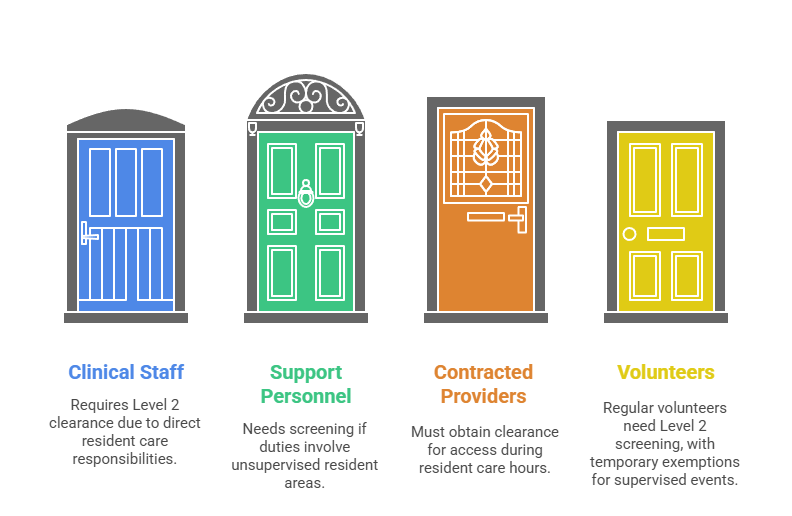 - Volunteers: Regular volunteers working with residents need Level 2 screening, though single-event volunteers at supervised functions may receive temporary exemptions.