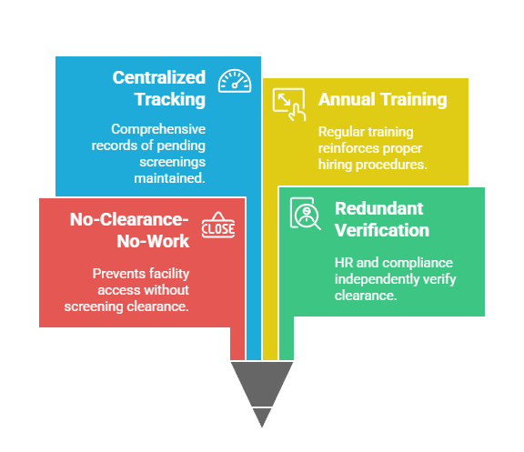 - Redundant Verification Systems: Both HR staff and compliance officers independently confirm clearance before employment start dates.