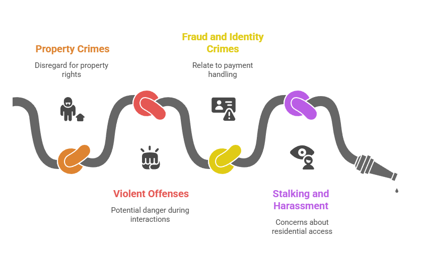 - Stalking and Harassment: Offenses involving unwanted contact or surveillance create concerns about residential delivery access.