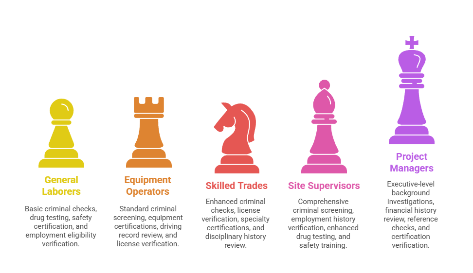- Equipment Operators: Standard criminal screening plus equipment-specific certifications, three-year driving record review, random drug testing enrollment, and operator license verification through issuing authorities
