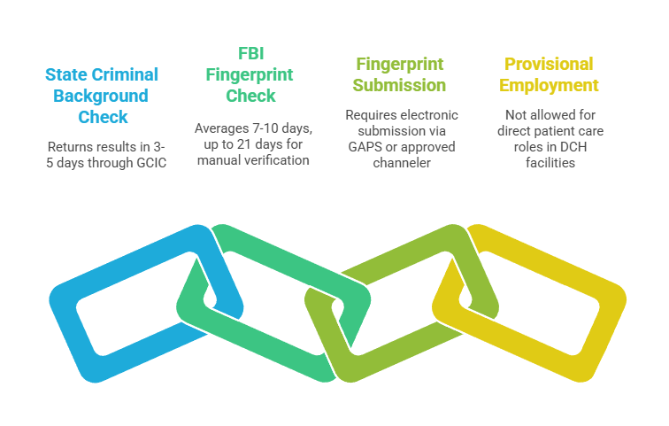 - State Criminal Background Check: Typically returns results within 3-5 business days through GCIC processing.