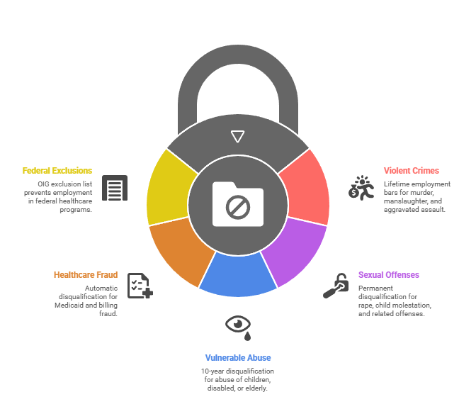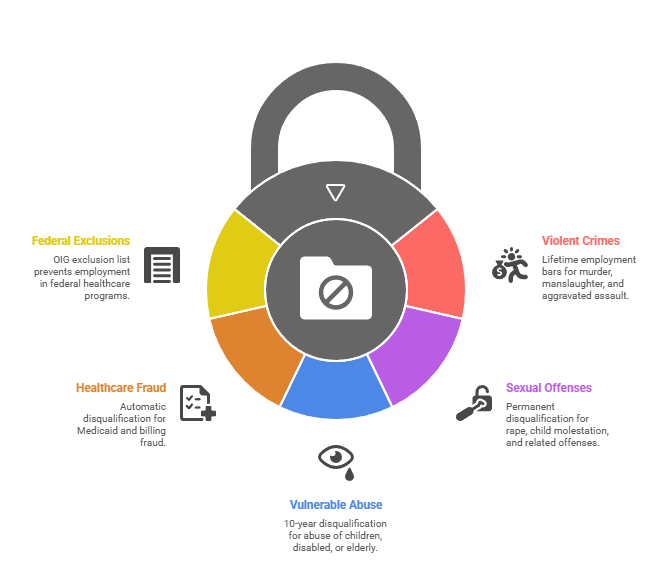 - Automatic disqualifiers include convictions for specified violent crimes, sexual offenses, abuse/neglect, and healthcare fraud within lookback periods ranging from 5 years to lifetime depending on offense severity.