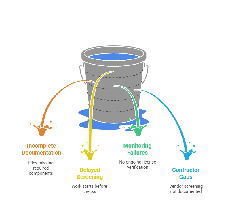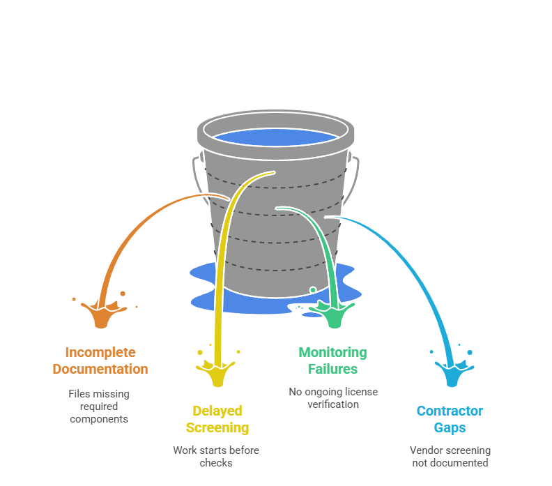 - Continuous Monitoring Failures: Facilities conduct thorough pre-employment screening but fail to implement monthly OIG/GSA re-checks or ongoing license verification, comprising 18% of audit findings.