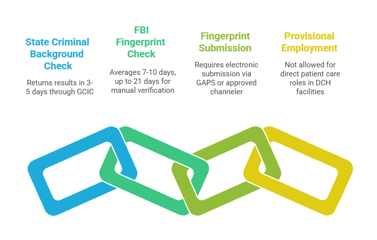 Georgia healthcare facilities must obtain both state and FBI fingerprint-based criminal history checks for covered positions. The Georgia Crime Information Center (GCIC) processes state-level criminal records, while FBI checks provide nationwide coverage including records from other states and federal jurisdictions.