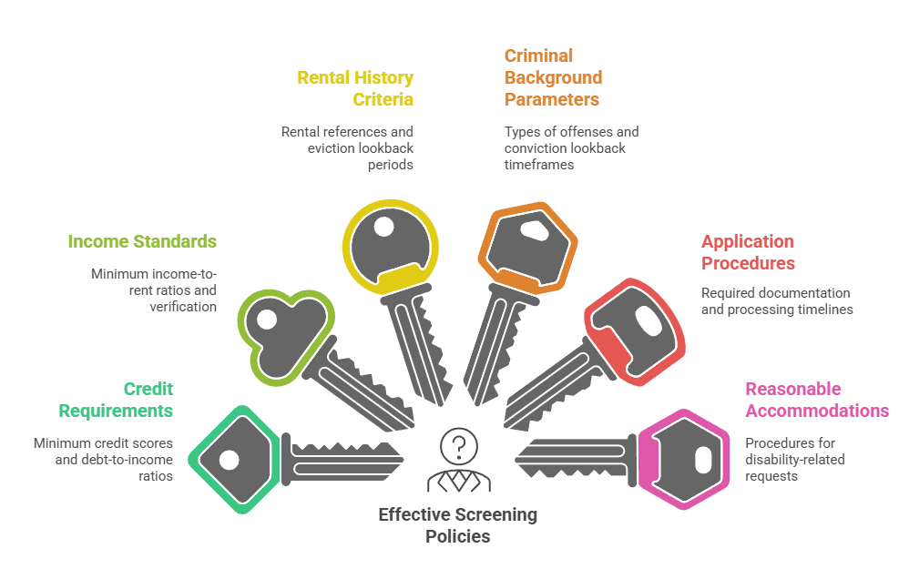 • All screening criteria must be documented in written policies and applied uniformly to avoid fair housing violations