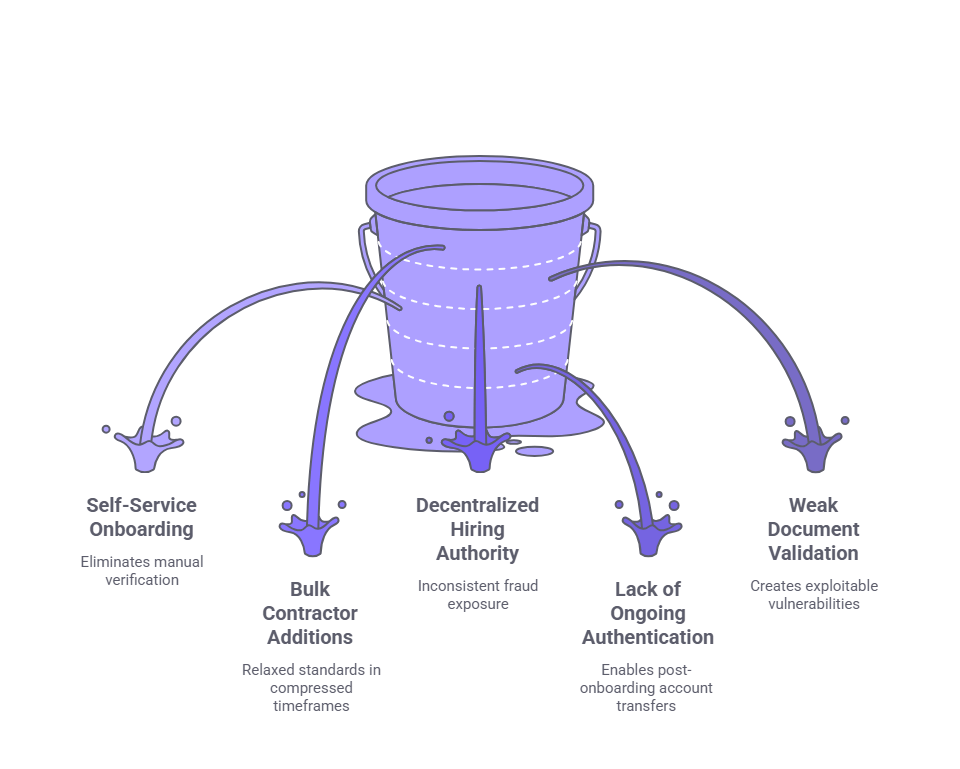 - Bulk Contractor Additions: Organizations that onboard large contractor cohorts in compressed timeframes often relax verification standards to meet operational deadlines. Fraudsters exploit these periods by submitting applications en masse, knowing that review rigor will be lower.
