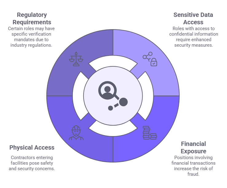 - Regulatory requirements: Certain roles may trigger industry-specific verification mandates.