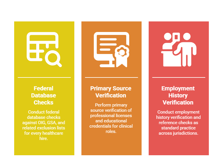 - Employers should conduct federal database checks against OIG, GSA, and related exclusion lists for every healthcare hire
