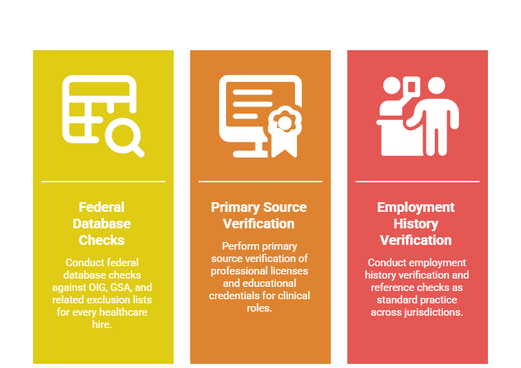 - Employers should conduct federal database checks against OIG, GSA, and related exclusion lists for every healthcare hire