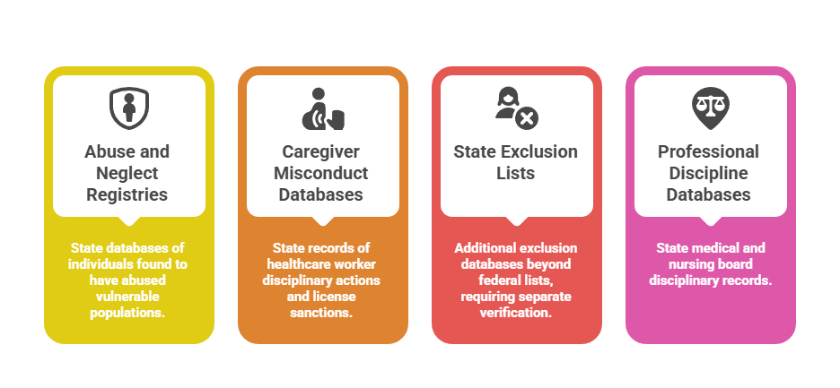 Certain states and municipalities maintain specialized registries that healthcare facilities must check before hiring or allowing patient contact. Registry types include: