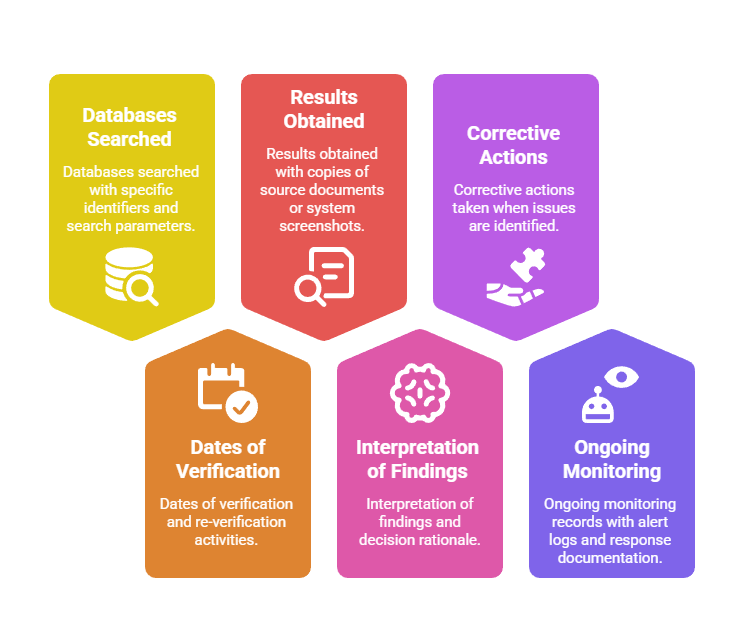 Comprehensive documentation should identify screening components performed, databases searched, search dates, results obtained, and how results were interpreted. Records should demonstrate exclusion database checking frequency and results, license verification with license numbers and expiration dates, and any identified issues along with assessment processes and decisions. Documentation serves as compliance evidence during regulatory surveys or audits and supports quality improvement efforts.