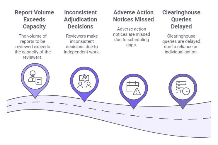 Standard screening processes are typically designed for sequential, one-at-a-time processing. A compliance officer reviews a report, makes a determination, and moves to the next file. That model fails not because people stop caring about compliance, but because the process was never engineered for concurrent workload.