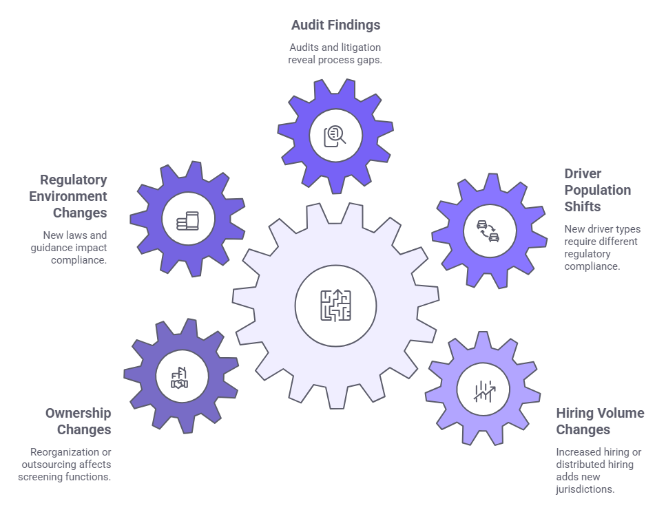 A screening program appropriate for a fleet of 50 drivers may not serve a fleet of 500. The trigger for re-evaluation is not always a compliance failure. Often, it is a change in operational scale, structure, or regulatory environment that the existing program was not designed to handle. Each of the following conditions signals that a formal program review is warranted: