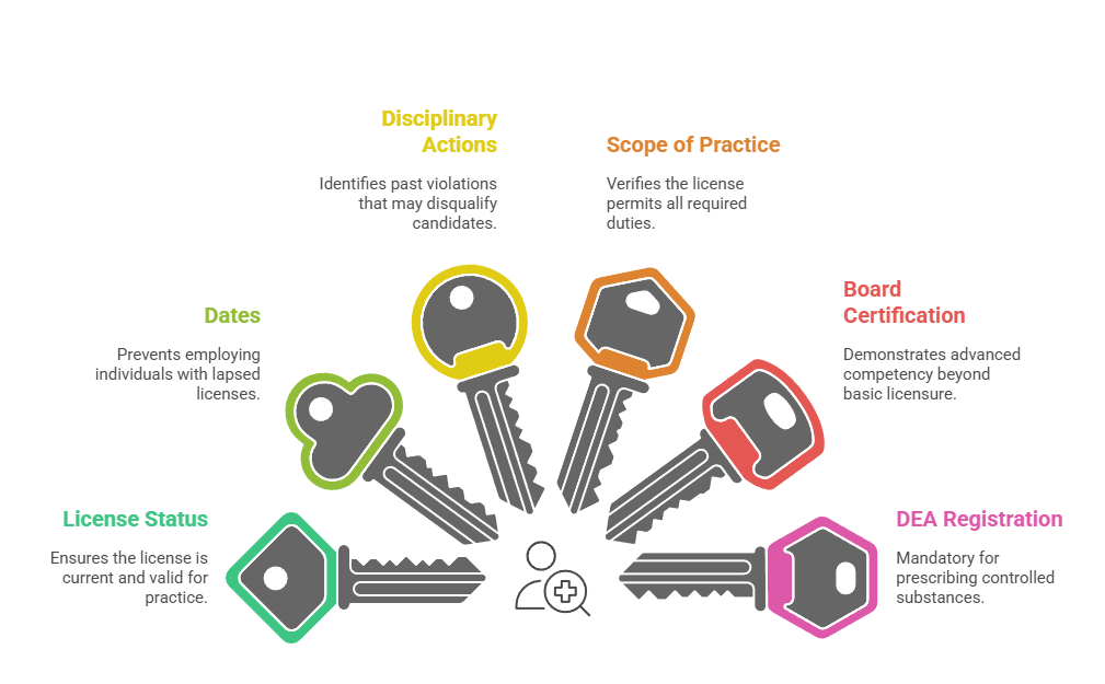 - Scope of practice limitations: Verifies the license permits all duties the position requires