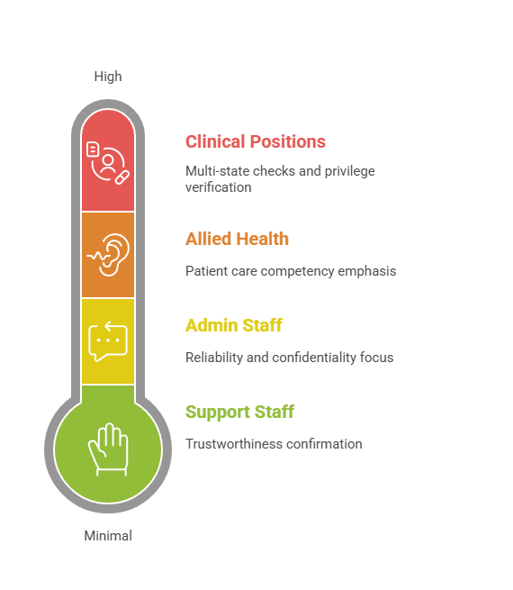 Different healthcare positions require different screening depths based on patient contact, PHI access, and clinical responsibilities. Small practices should develop three or four screening tiers corresponding to role categories. This approach ensures appropriate verification without unnecessary administrative burden for lower-risk positions: