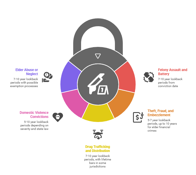 - Disqualifying offenses typically include violent crimes, sexual offenses, abuse/neglect convictions, and theft-related crimes, though lookback periods range from 5 years to lifetime depending on offense severity and state law.