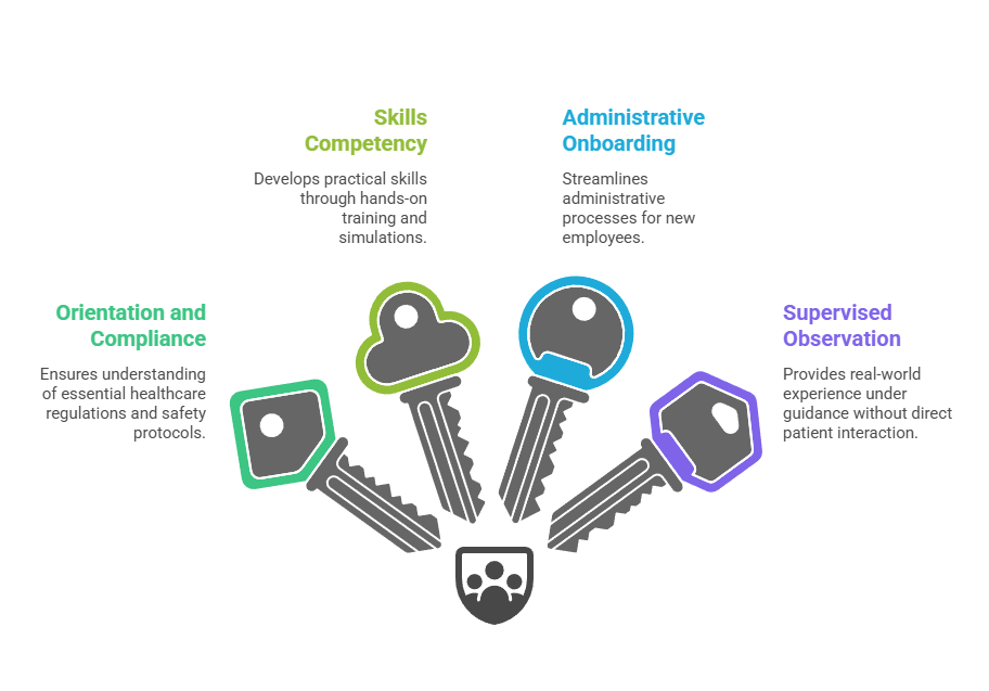 - Orientation and compliance training: Covers HIPAA, safety protocols, infection control, and agency policies without patient involvement.