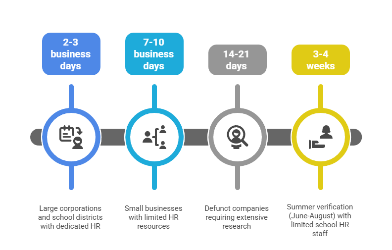 - Large corporations and school districts: 2-3 business days with dedicated HR departments and automated verification services