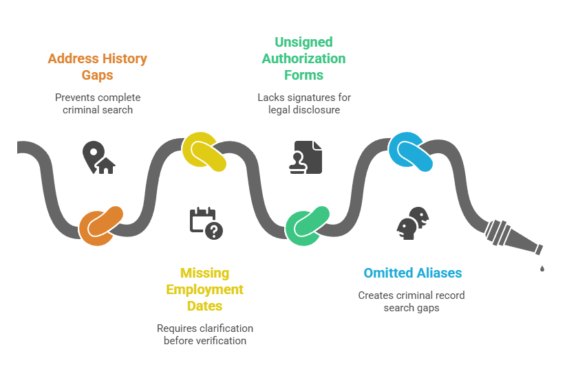 Incomplete background check applications represent the single most common delay factor, affecting approximately 35% of submissions. Missing signatures, incomplete address histories, unexplained employment gaps, and omitted middle names prevent background check companies from conducting thorough investigations. These issues add 5-15 business days to processing timelines.